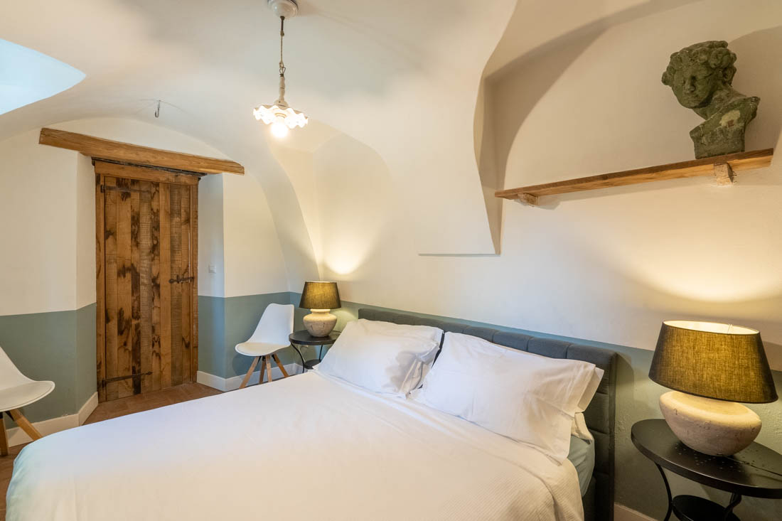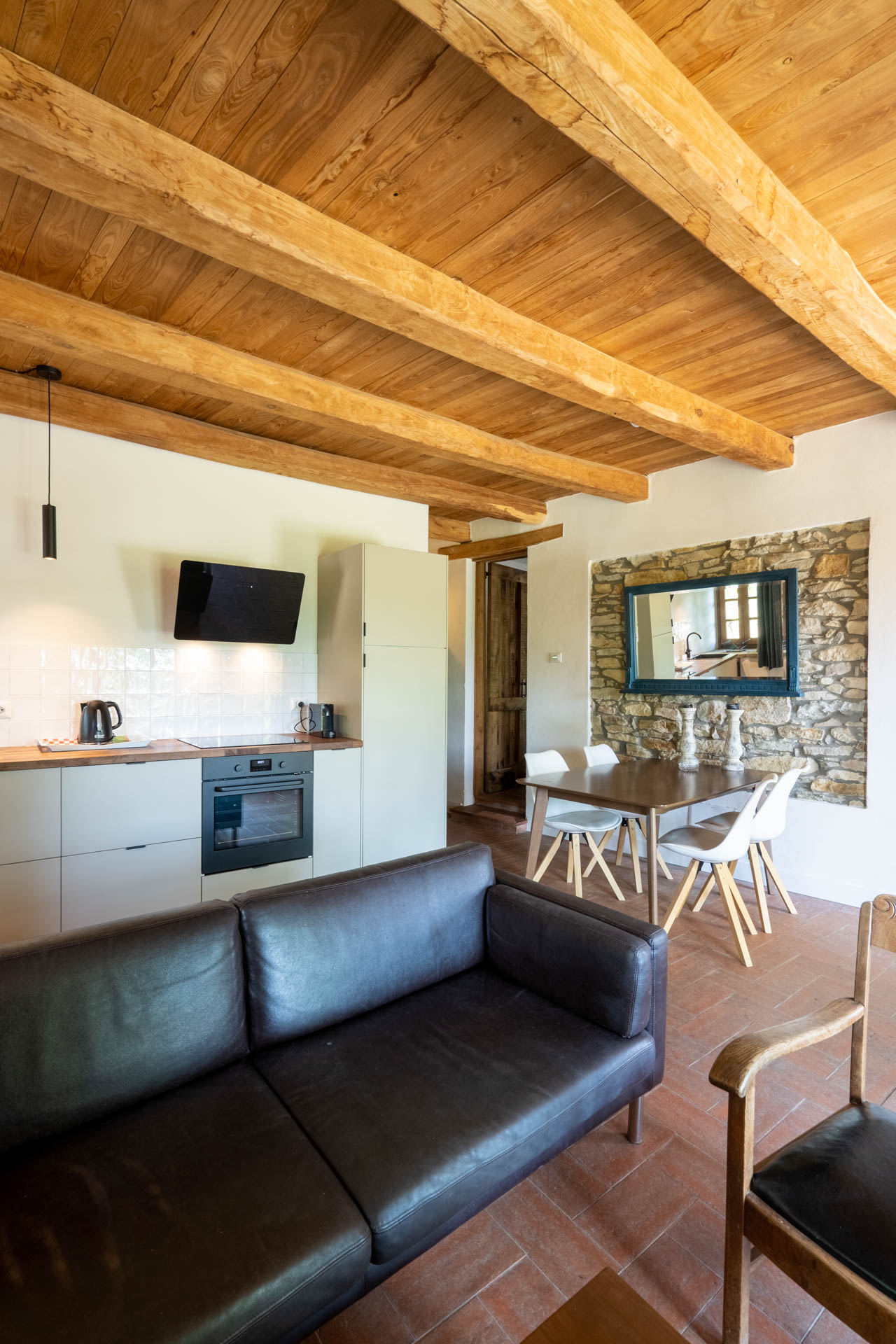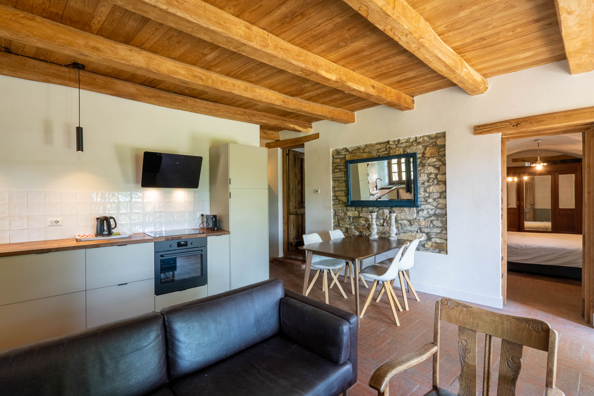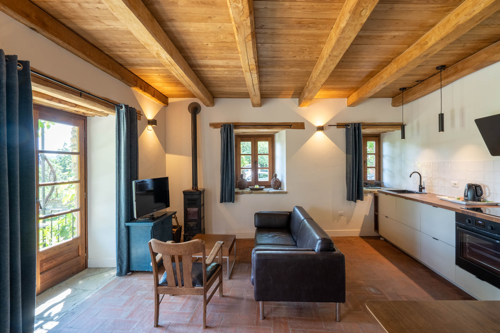 L’appartamento Rosmarino con tre stanze, situato al piano terra del casale, un tempo era la stalla per le mucche ed è stato restaurato con stile utilizzando materiali autentici. I dettagli della sua precedente funzione sono visibili nel soffitto.