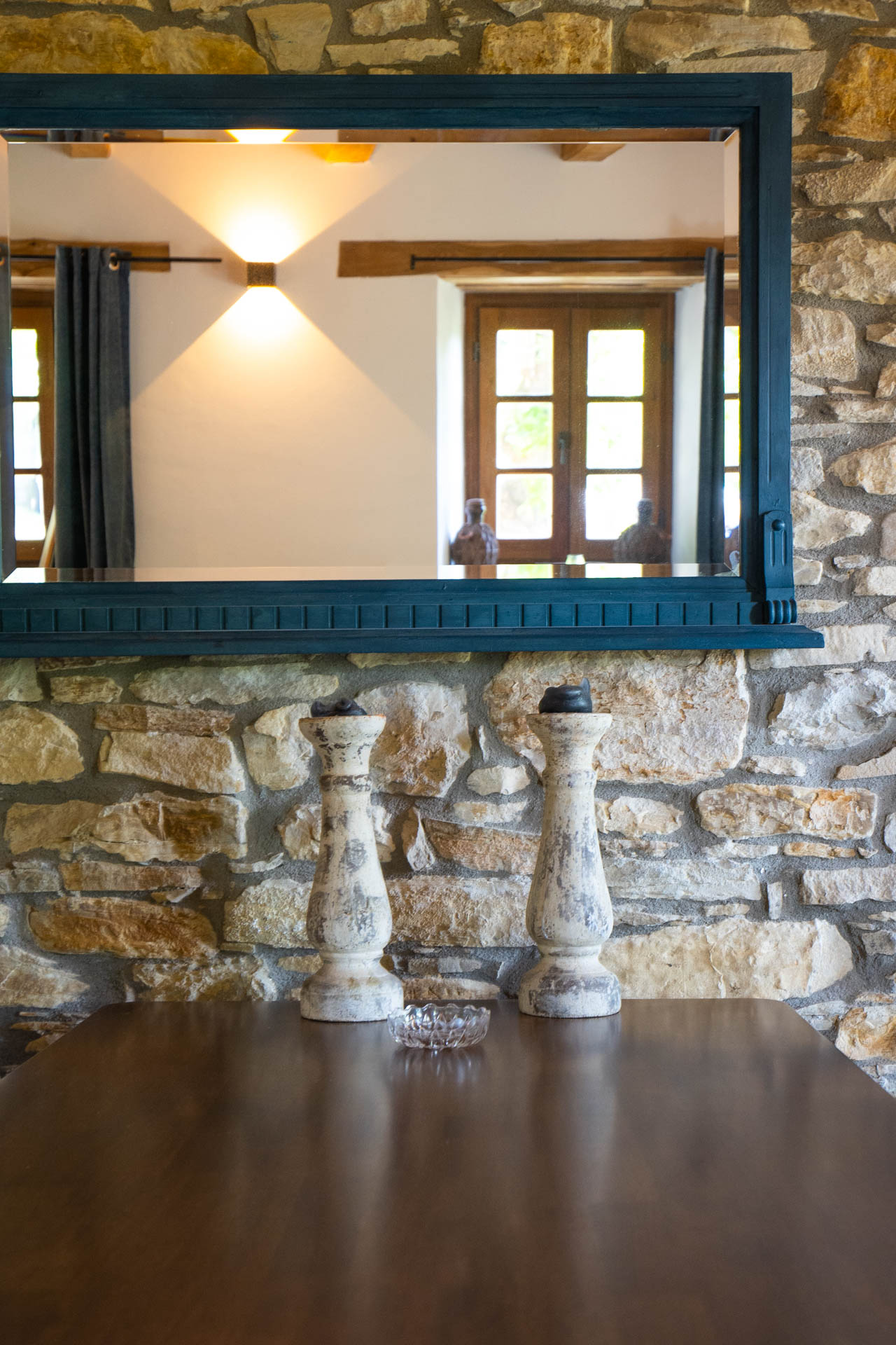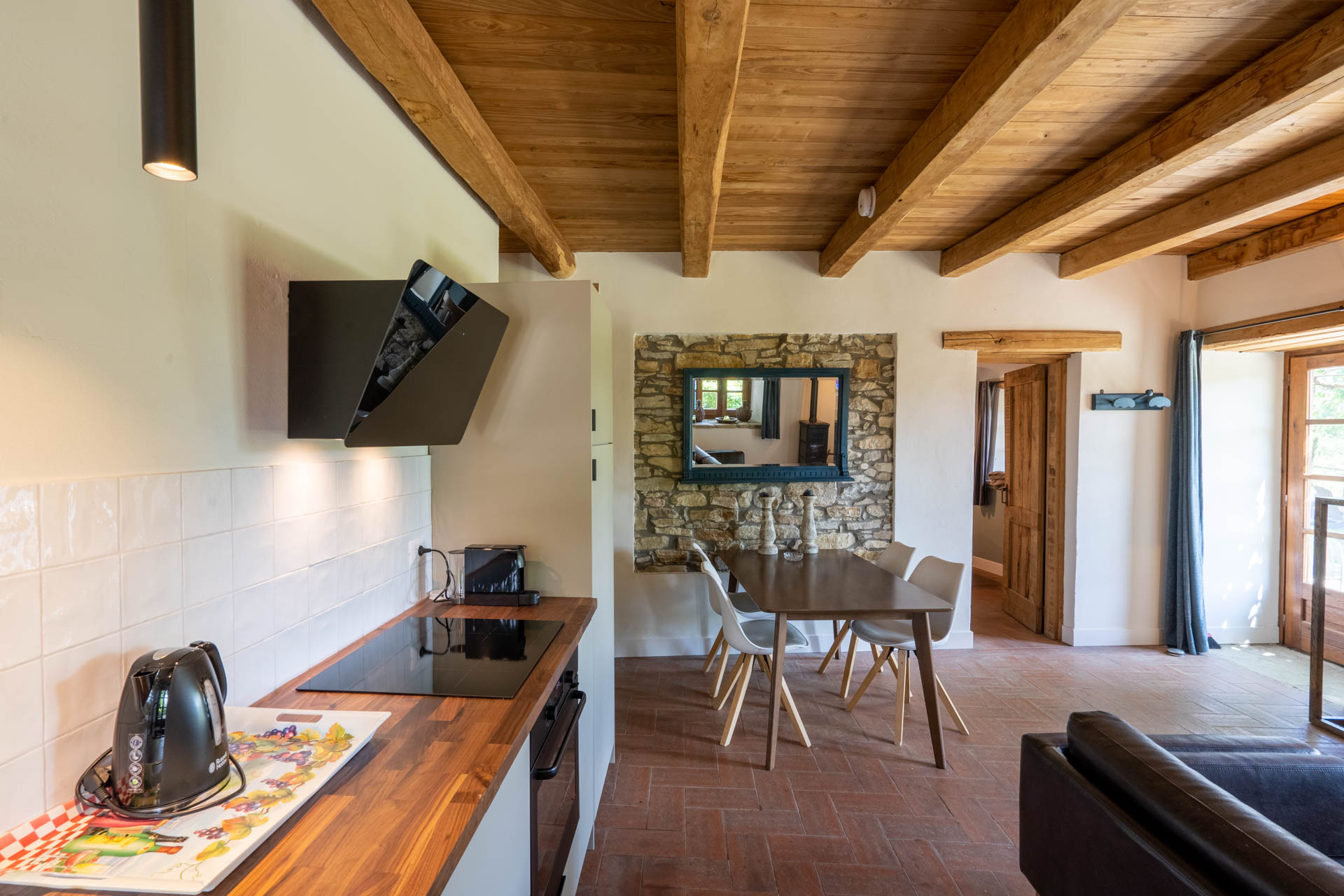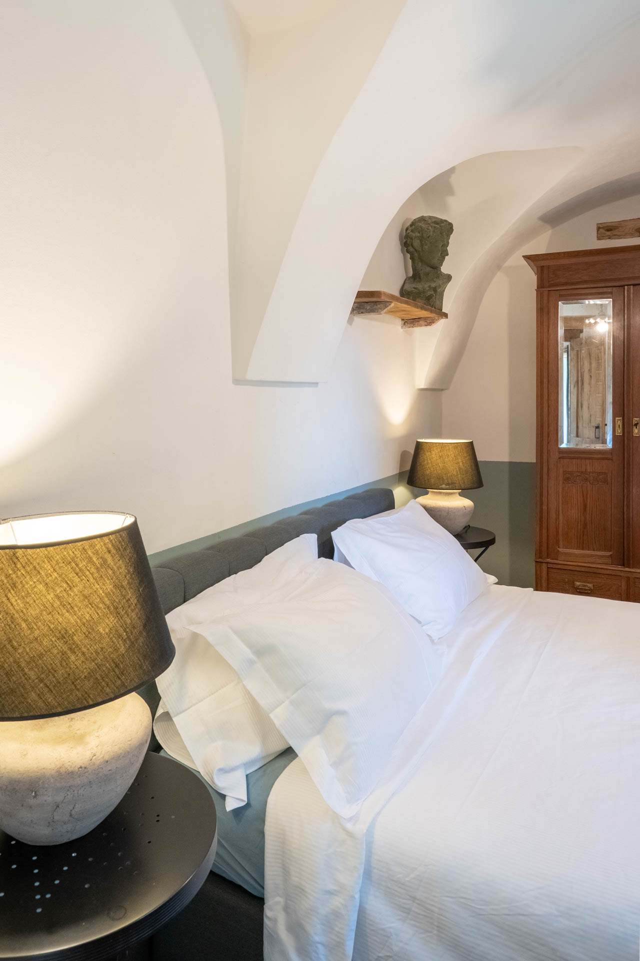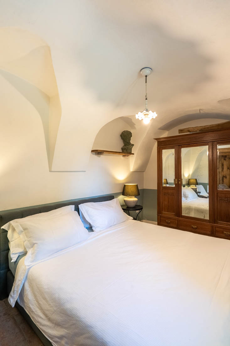 L’appartamento Rosmarino con tre stanze, situato al piano terra del casale, un tempo era la stalla per le mucche ed è stato restaurato con stile utilizzando materiali autentici. I dettagli della sua precedente funzione sono visibili nel soffitto.