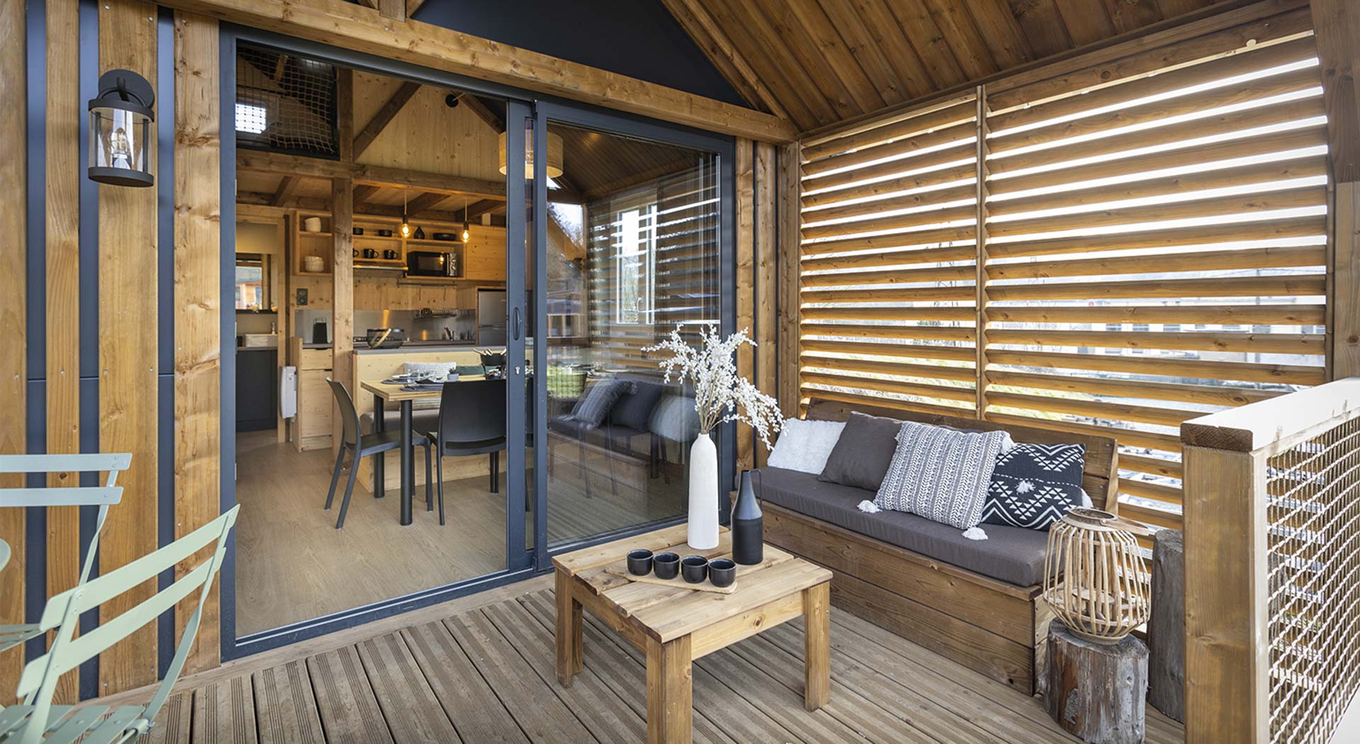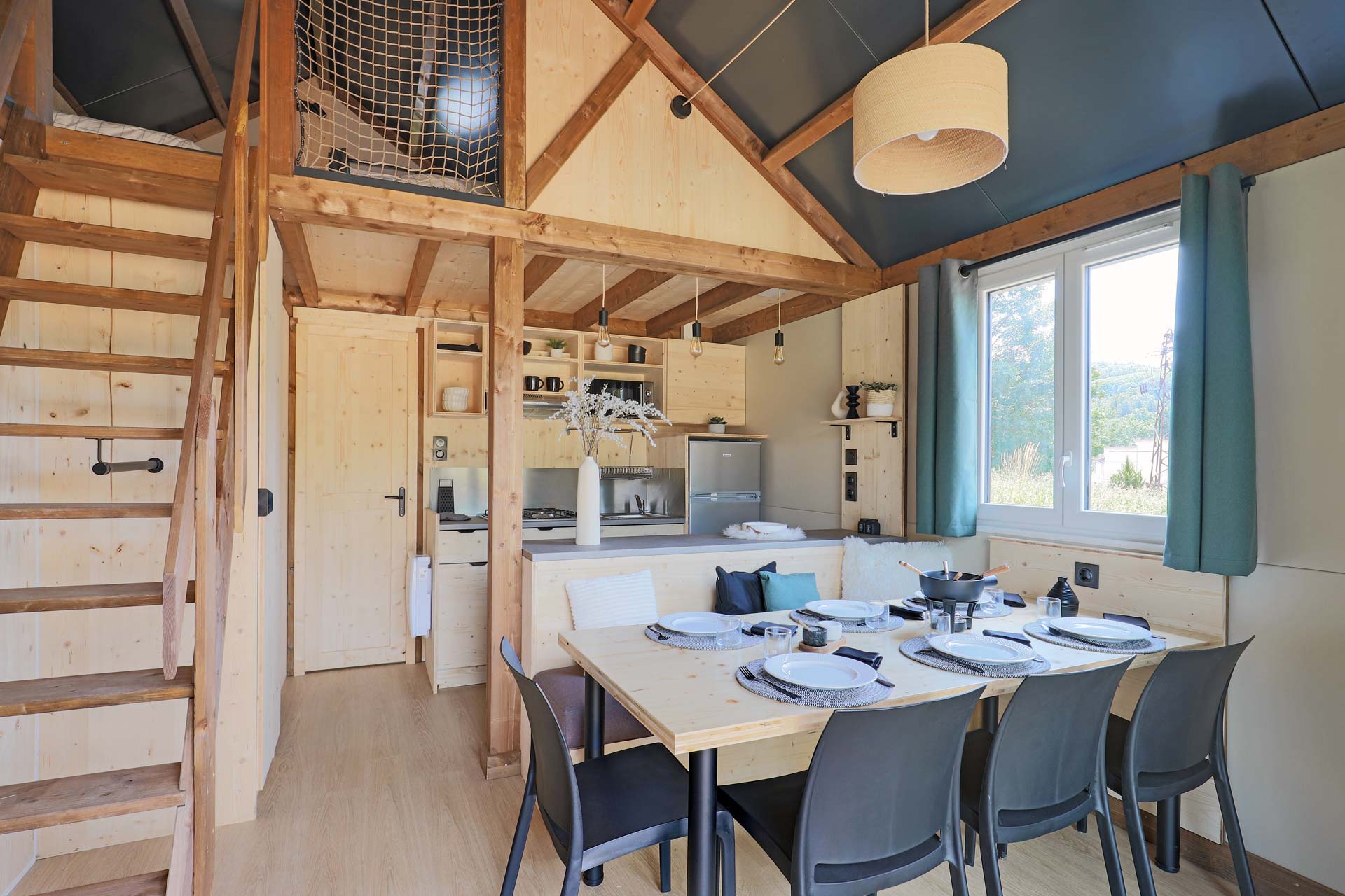 De natuurhuisjes beschikken ook over een lichte woonkamer en een volledig uitgeruste keuken met vaatwasser, elektrische kookplaat, magnetron en koelkast met vriesvak.